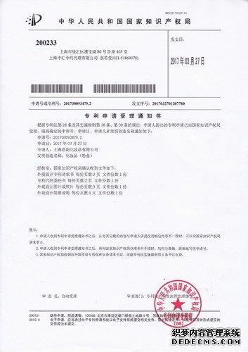 热烈庆祝我司于2017年上半年申请到两项专利成功:一项外观设计专利,一项发明专利。其中外观设计专利已得到授权,发明专利已受理,并进入审核阶段。